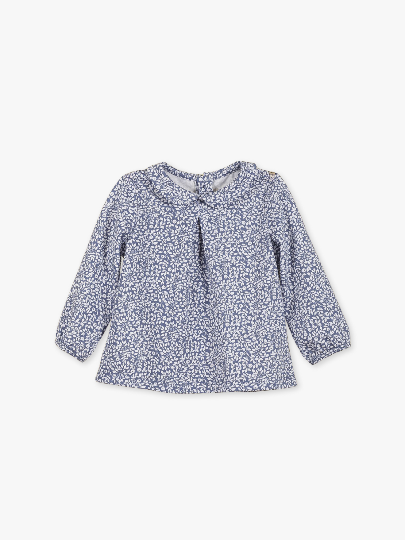Blouse Fleurie en Toile à Col Volanté et Boutons en Nacre – 100 % Coton – Bleu et Blanc