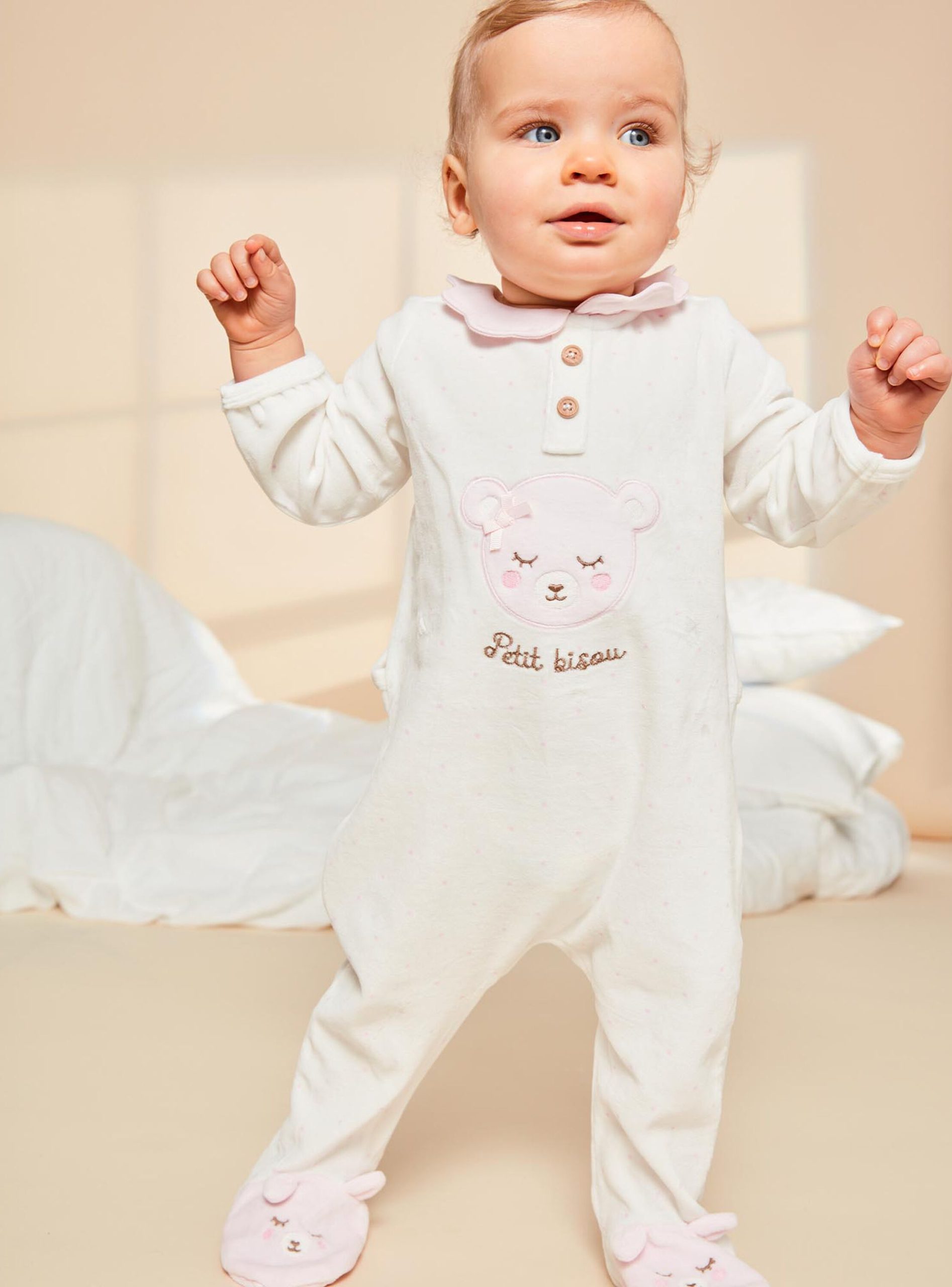 Grenouillère Ecrue en Velours à Pois et Tête d’Ours