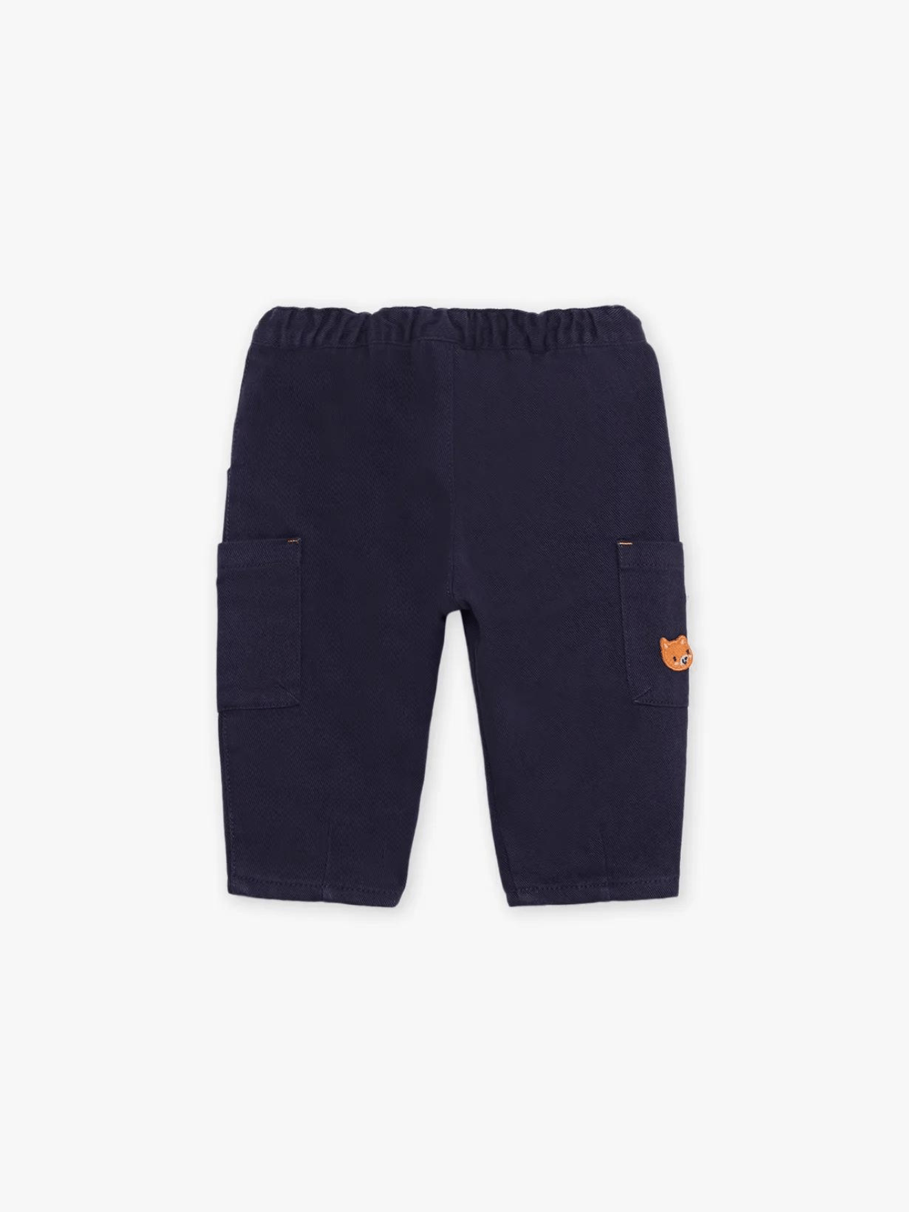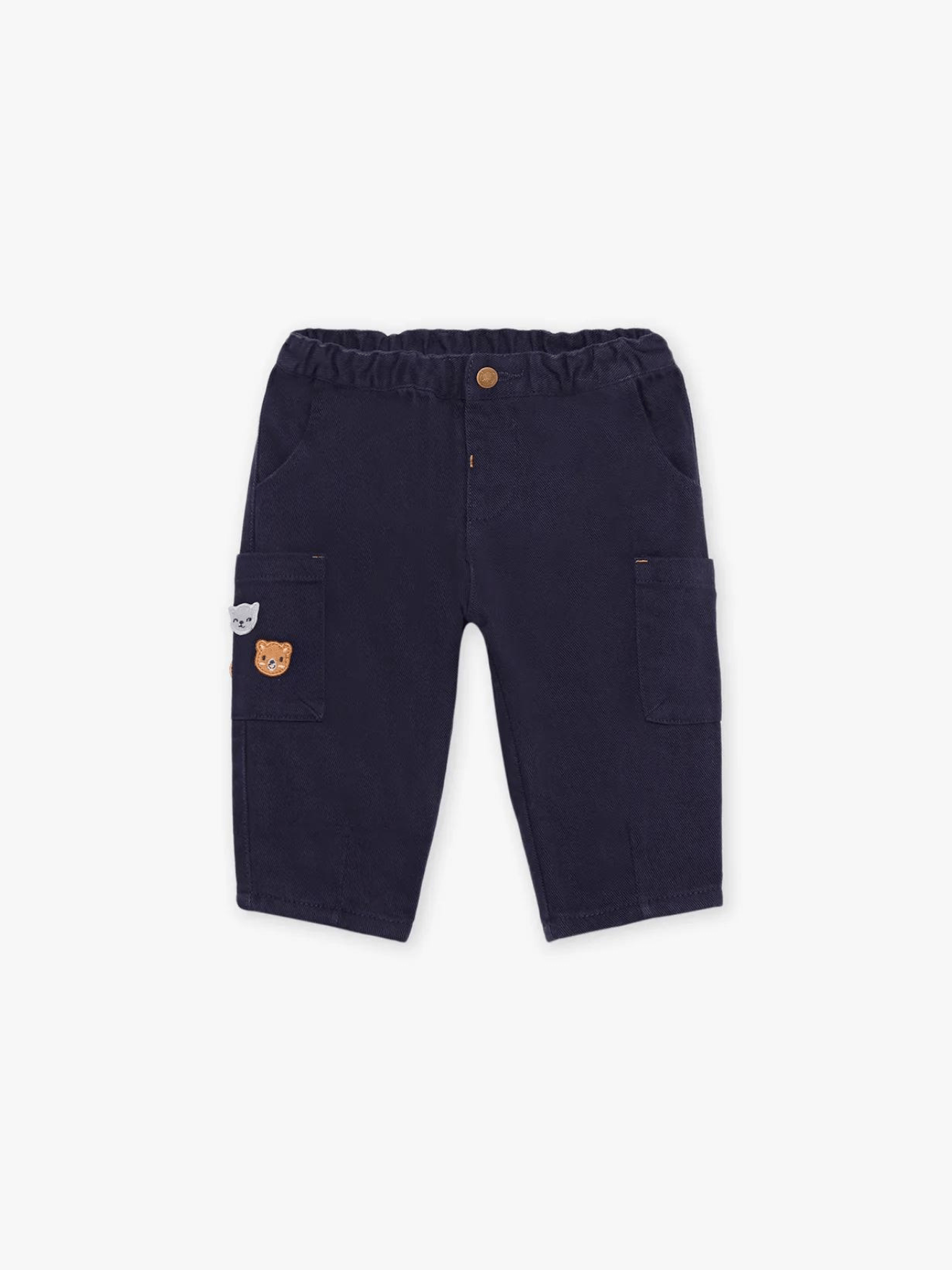 Découvrez notre pantalon en twill bleu marine, une pièce pratique et élégante pour votre petit aventurier. La matière en twill est associée à une doublure en jersey pour un confort optimal. L’ouverture par bouton-pression en métal sur le devant facilite l’habillage. Ce pantalon offre 4 poches, avec une charmante décoration de têtes d’animaux sur la poche droite.