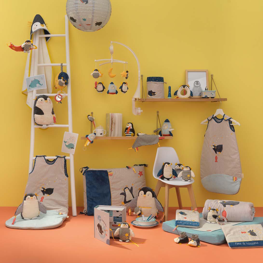 Jouet musical Pingouin avec un petit poisson à tirer pour déclencher la musique ! Le ventre du pingouin offre une texture velours, tandis que les ailes présentent des tissus imprimés.